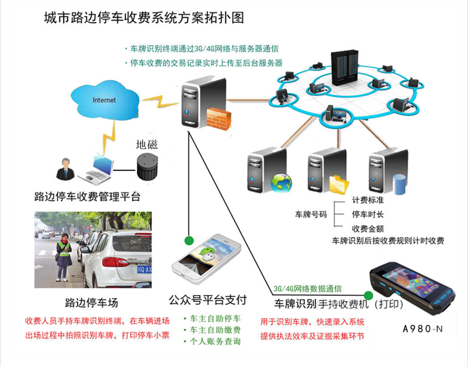 該系統平臺預留拓展接口,可以實現與城市監管平臺及城市交通車輛管理部門監管信息對接,是實現城市管理與交通車輛管理現代化的重要環節。通過運營商網絡或無線寬帶網絡技術的應用,實現信息源的采集,保證對任一占道停車場實行全區域、全時段狀況的實時監控與收費管理。